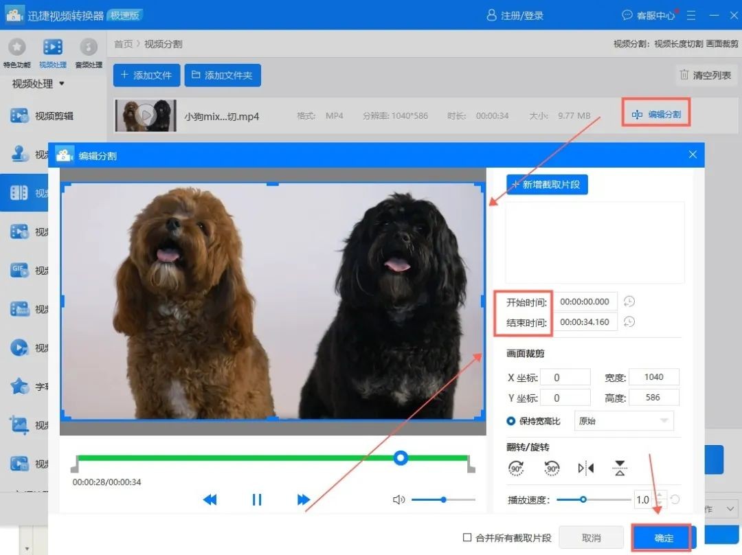 视频文件导入后,直接点击‘编辑分割’工具,设置开始和结束时间或拖动时间轴确定视频片段,添加到列表点击确定即可;