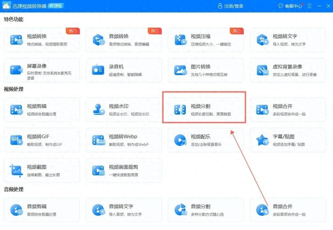 打开安装好的软件,进入首页就能看到多种功能,在‘视频处理’中选择【视频分割】功能,导入需要截取的视频素材;