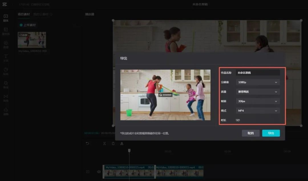 完成视频片段分割后,在右上角点击【导出】按钮,就能完成视频截取啦~还可以设置分辨率、质量、帧率等等!