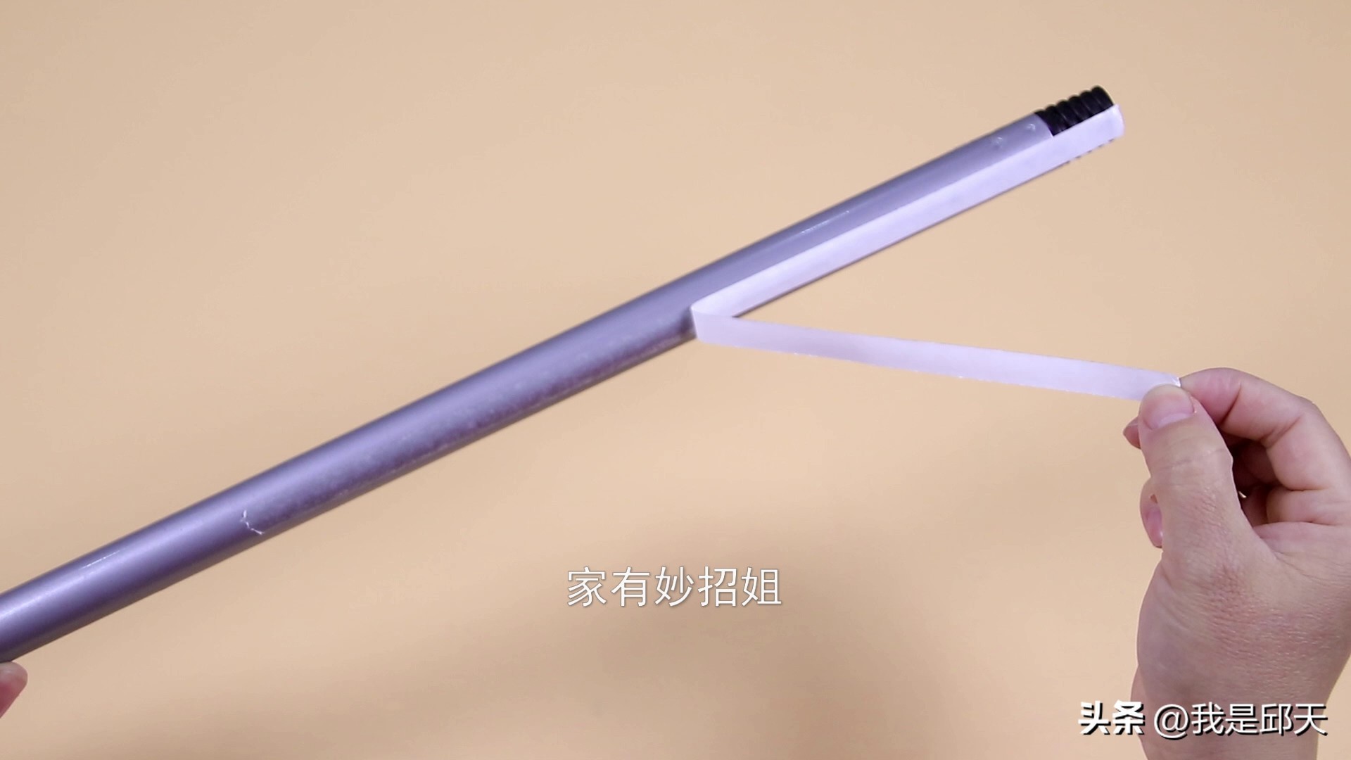 接下来,再给大家分享一下羽绒服毛领的改造。方法也很简单,我们先准备一根棍子,像平时我们家里使用的扫把、或拖把坏掉之后,这个棍子也不要扔了,我们就可以利用上它。只需要在棍子的两边分别粘上一长段的双面胶。