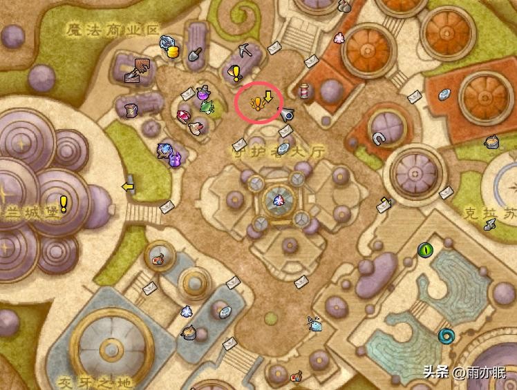 我们来到达拉然之后,地图上可以看到一个传说任务,就是红圈圈起来的叹号。他会给我们职业大厅的任务,注意:每个职业任务都一样,只要接同样图标的就行。