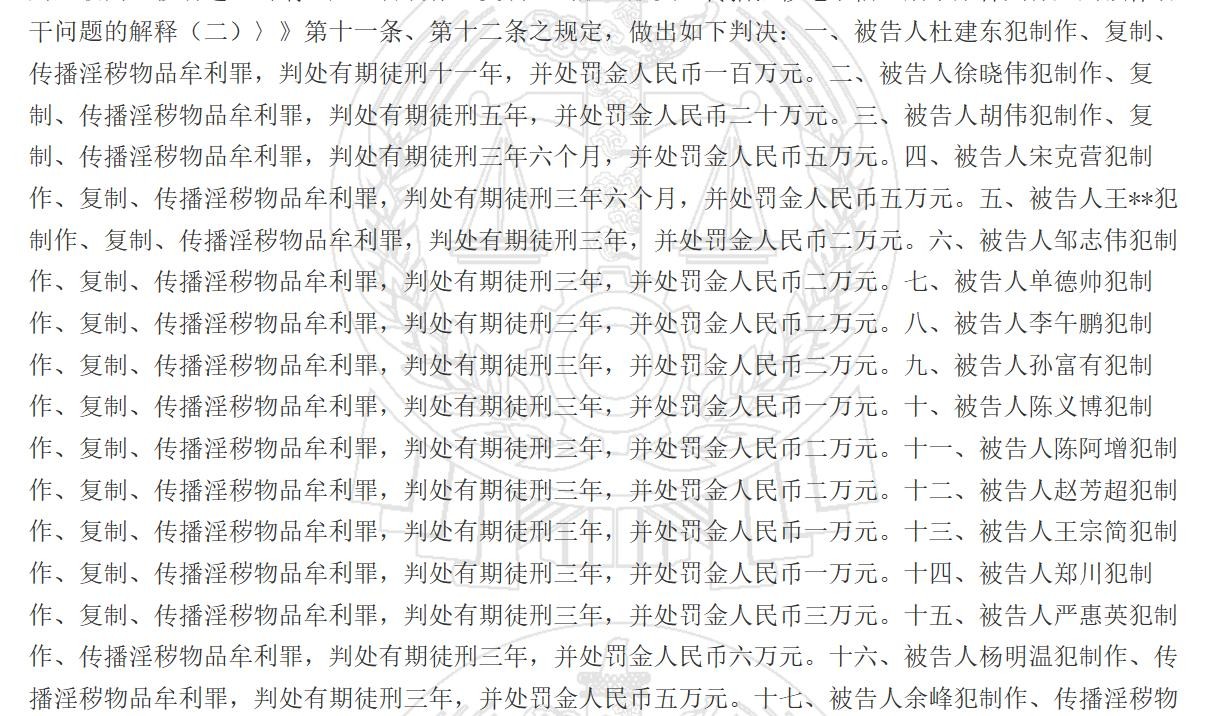 一审判决主犯:被告人杜某东犯制作、复制、传播淫秽物品牟利罪,判处有期徒刑十一年,并处罚金人民币一百万元。二、被告人徐某伟犯制作、复制、传播淫秽物品牟利罪,判处有期徒刑五年,并处罚金人民币二十万元。三、被告人胡某犯制作、复制、传播淫秽物品牟利罪,判处有期徒刑三年六个月,并处罚金人民币五万元。四、被告人宋某营犯制作、复制、传播淫秽物品牟利罪,判处有期徒刑三年六个月,并处罚金人民币五万元。