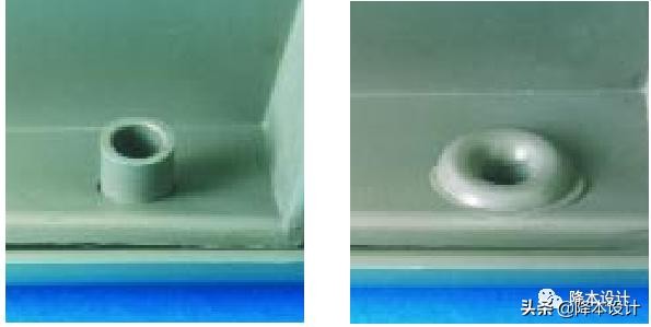 当产品外形有平整度要求、或有其它装配要求时,常常要求热熔后成型铆头不能突出于表面,此时可将被紧固零件对应孔设计成沉孔。沉孔热熔具有以下特点: