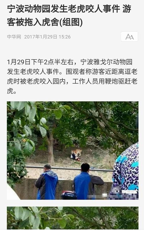 老虎伤人的事件在我国也常有发生,2017年1月29日,在浙江宁波雅戈尔动物园内,一名游客翻越动物园的围墙直接跳进虎园内,遭到老虎袭击。