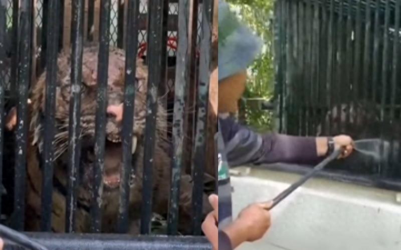 另外,这只被关在笼子里的老虎更多的是出于应激反应,当被铁笼困住,身边围着一群两脚兽,还有一股冰凉的水喷来时,它更多的是恐慌,龇牙咧嘴其实是为了吓唬曾经它的食物们。