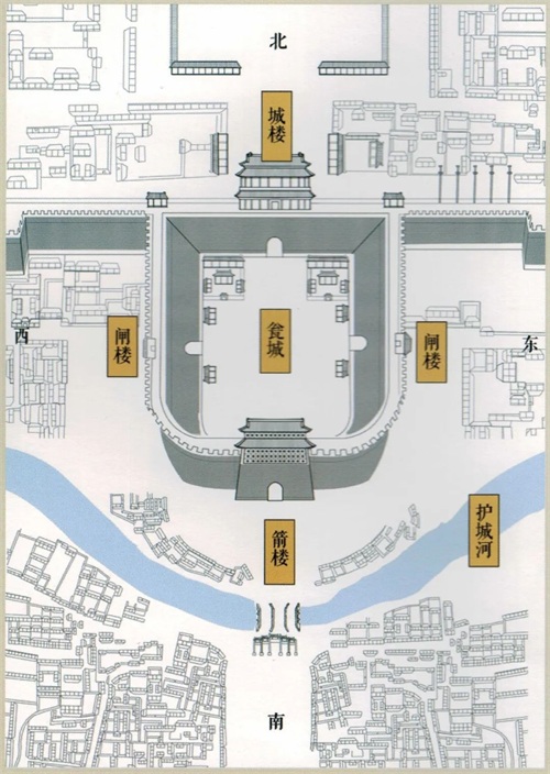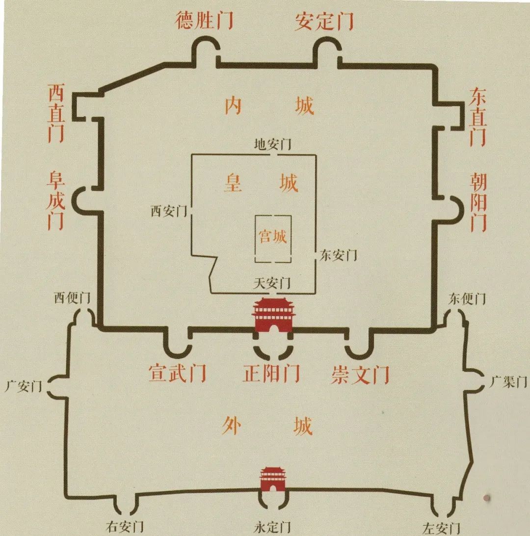 四门三桥五牌楼。明清时期的正阳门包括城楼、箭楼、闸楼、瓮城(也叫月墙)、庙宇等,与整个南城垣连为一体,外有护城河绕行,形成了规模宏大、防守严密的军事防御体系。正阳门城楼为重檐歇山三滴水楼阁式建筑,面阔七间,进深三间,上、下两层四面均开门,城楼坐落在砖砌城台上,城楼连城台通高43.65米。瓮城是在城门外侧砌筑的圆形或方形小城,将城垣、门楼、箭楼、闸楼连为一体,形成对城门的保护屏障。内城九门中,正阳门瓮城规模最大,平面形状大致呈长方形,南北长108米,东西宽85米。闸楼是修建在瓮城之上的军事防御设施,下设券门,供官民车马进出城池,门洞上方置千金闸。正阳门瓮城上修筑闸门两座,分别位于瓮城的东、西两侧。箭楼位于城楼的正前方,面向城外的三面均开设有箭窗,用于对外防御射击。正阳门箭楼为重檐歇山顶堡垒式建筑,面阔七间,北出抱厦五间,上、下四层,通高35.37米,在京师各门的箭楼中最为高大。明清时期的正阳门,一圈瓮城连接着城楼、箭楼、东西闸楼等四个城门,箭楼前是三座石拱桥组成的“正阳桥”,桥南即通向前门大街的正阳桥牌楼,因其建筑样式为五间、六柱、五楼而得名“五牌楼”,这就是老百姓所说的“前门楼子九丈九,四门三桥五牌楼”。
