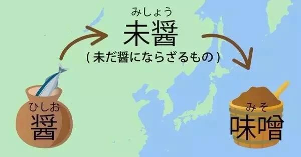 关于味噌的历史起源,一般认为它是从古代中国传来的酱所演变的。目前已知最早的味噌的文献记载出现于公元八世纪的奈良时代,当时它不叫味噌,叫做未酱(mishou,也有写作“末酱”的),发音和现在的味噌(miso)十分接近。“未酱”的含义是说酱中还残留有豆粒,在这段时期味噌是上流社会的食物,庶民是难以尝到的。经过几百年的文字演变,名字从未酱到味酱、味曾、最后在十三世纪时变成了味噌。不过当时的味噌和现在的不一样,做法和味道更接近中国的豆豉。由于农业技术发展,大豆产量提升,农民也可以在自家制作味噌了,味噌渐渐普及开来。