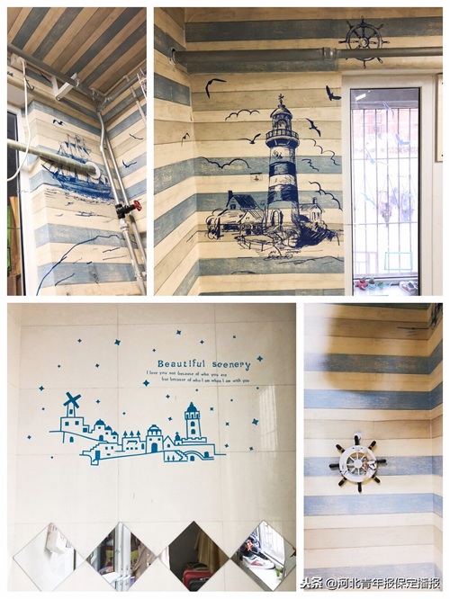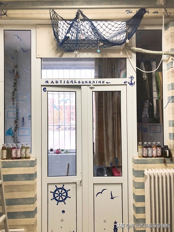 据了解,该宿舍为混合宿舍,各个专业的女生以蓝色为基调装扮了整个寝室,面墙加入了船舵、海鸥、灯塔、帆船等元素,并在室内和阳台布置了渔网、鱼骨等挂件,别出心裁。
