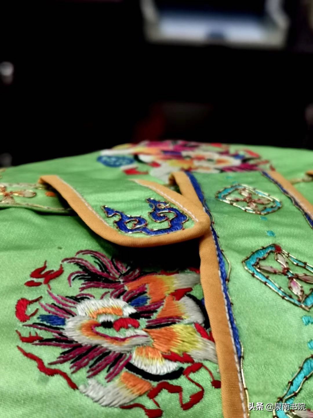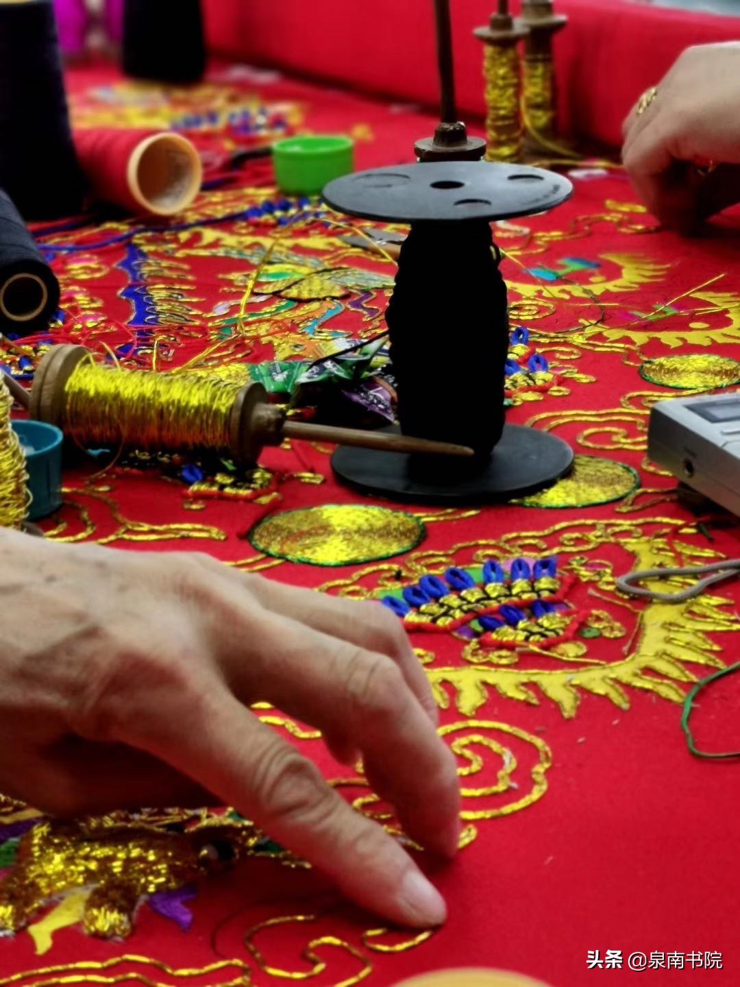 提起刺绣,很多人脑海里会自然浮现出“苏绣”“蜀绣”这样的艺术精品。不过,闽南地区却有着独树一帜的刺绣类别,它就是“金苍绣”,可以与这些名绣相媲美。“金苍绣”系泉州非物质文化遗产 ,相传,“金苍绣”与唐时“蹙金绣”工艺相同,即用金丝盘结成花朵的纹式再固定到丝绸上面,多用于宗教用品或是戏服。“绣罗衣裳照暮春,蹙金孔雀银麒麟”,诗人杜甫在《丽人行》中描写的奢华衣服便是唐代风靡的“蹙金绣”。