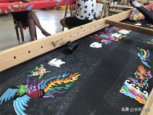 传统的金苍绣比起普通的刺绣要复杂许多。传统的金苍绣一般要经过描图、固定、绕线、合成四大步骤。而传统浮雕是用棉花填充的,在描好图的绸缎上,用纱网将棉花固定出龙神或是神兽头像的图案。