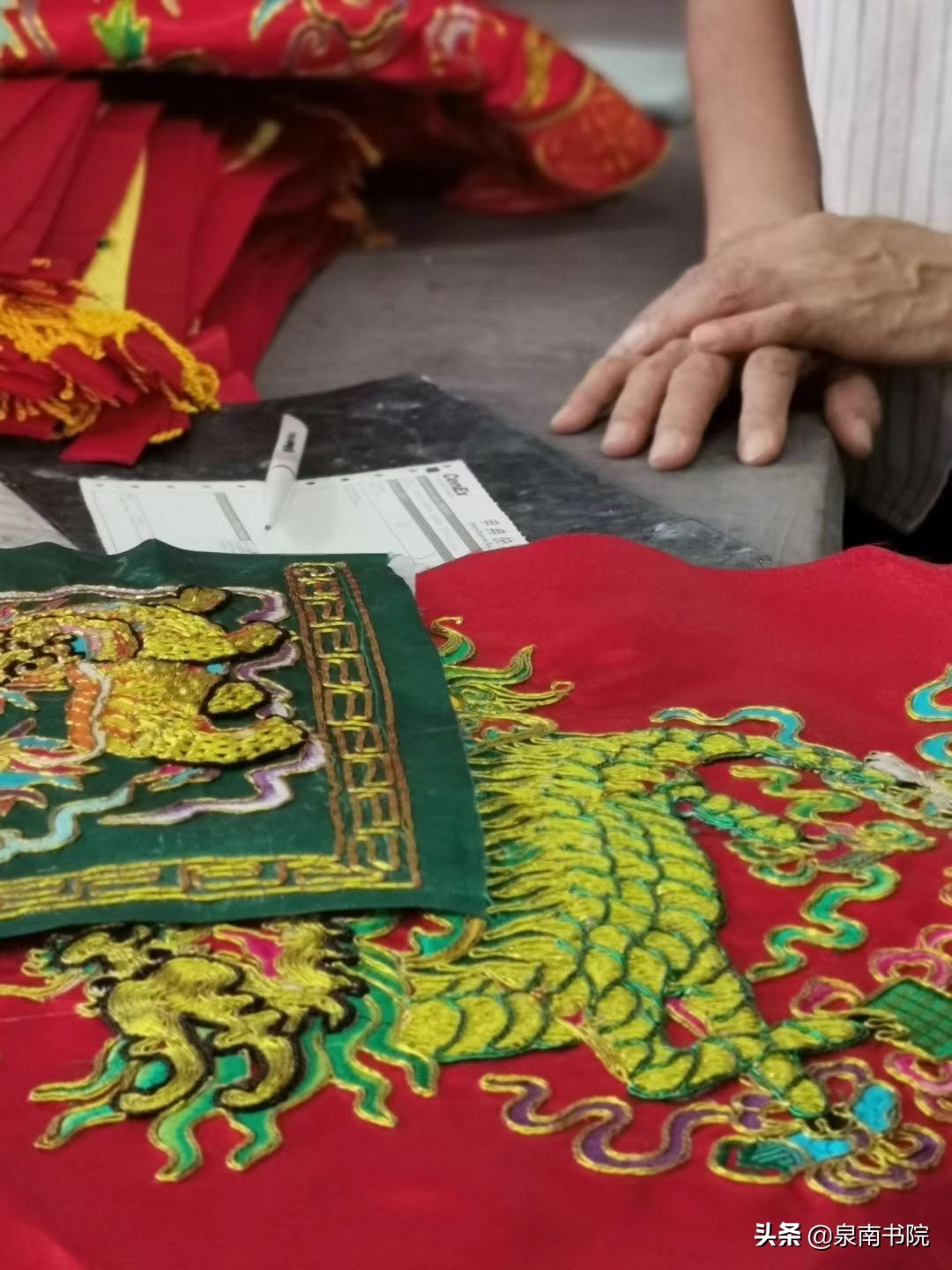自古以来,闽台地区各种民间信仰颇为兴盛,衍生出许多宗教用品。挂在宫庙门楹上的彩、祭桌的桌围、神佛塑像的穿着,还有神佛出巡所用的伞布、绣旗、幢幡以及道服、戏服、木偶服……这些物品,离开了金苍绣,似乎便少了几分庄严与神圣。