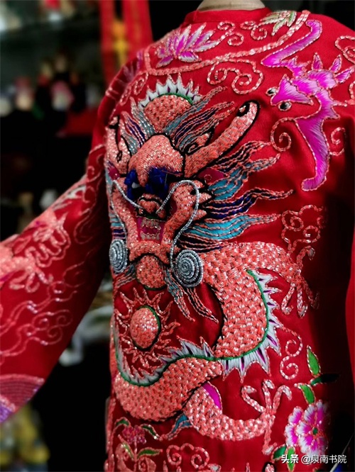 浮雕浮起度的大小也全凭绣工对于绣品形象的拿捏。为了让龙神呈现出鳞状感,绣金线前还要在棉花上缠绕一层较粗的呢绒线,才能绣出龙鳞的凹凸感。