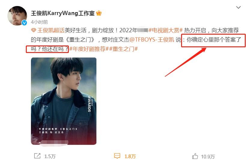而在王俊凯的工作室,以及王俊凯本人的账号中,能看到工作室更新了一条重生之门的推荐文,还问王俊凯你确定心里那个答案了吗?他还在吗?但并没有回应网络上的传闻,也没有辟谣王俊凯会退圈。王俊凯本人则是更新了一条有关自己代言高奢品牌的时尚男装秀,也没有对网传退圈一事作出回应。