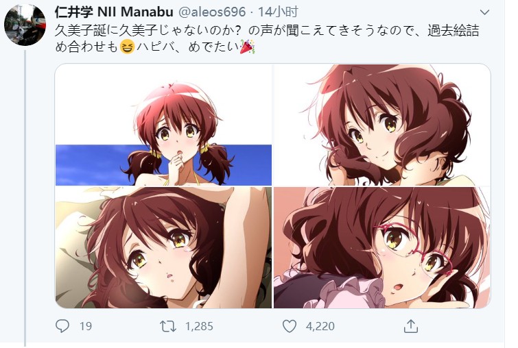 另外画师仁井学今天也特意在推特上重发了几张自己绘制的黄前久美子插图,然后还特别画了张高坂丽奈穿着兔女郎服装祝久美子生日快乐的贺图,之前他给九美子也出过兔女郎,这下两人成双成对了,可喜可贺,可喜可贺!
