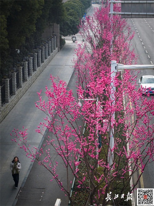2月25日,汉口发展大道新华路口至汉口火车站附近,成排梅花怒放。记者胡冬冬 摄