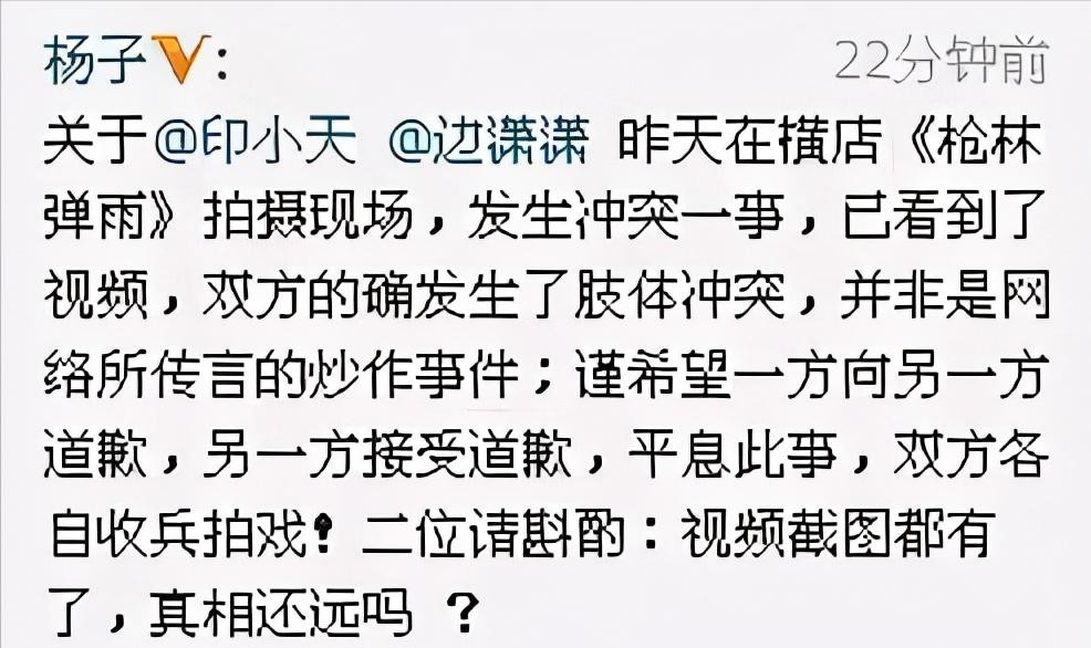 杨子发文表示,他已经拿到了片场的监控录像,在此奉上一张监控视频截图,并劝印小天对边潇潇进行道歉。