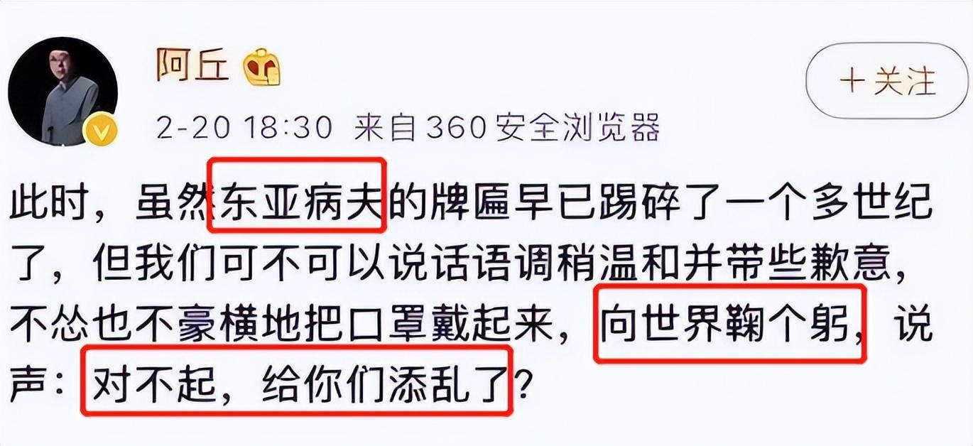 阿丘对此却是很认同的,并且在自己的社交平台上“东亚病夫”、“向世界鞠躬”、“对不起,给你们添乱了”,这样的字眼还真是扎的人眼生疼。