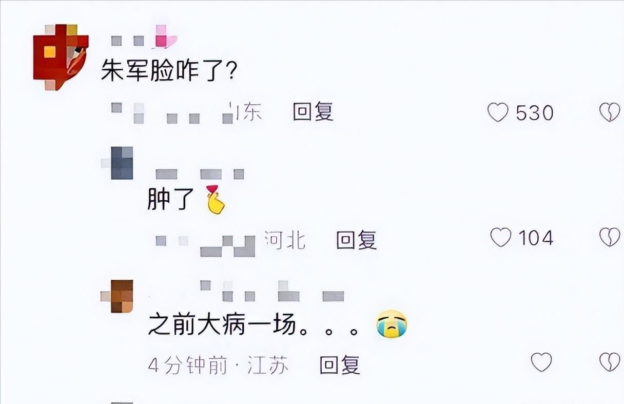 然而,照片里的朱军气色看起来十分差,脸部有非常明显的浮肿,整个人都是一副大病初愈的样子。