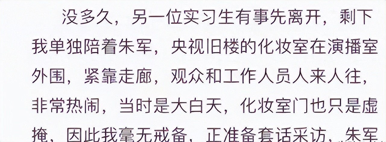 当时的化妆室里只有朱军一人,出于对他的信任,再加上当时是白天,大门还开着,所以她也并没有多想,只是安静的准备自己等下的采访。