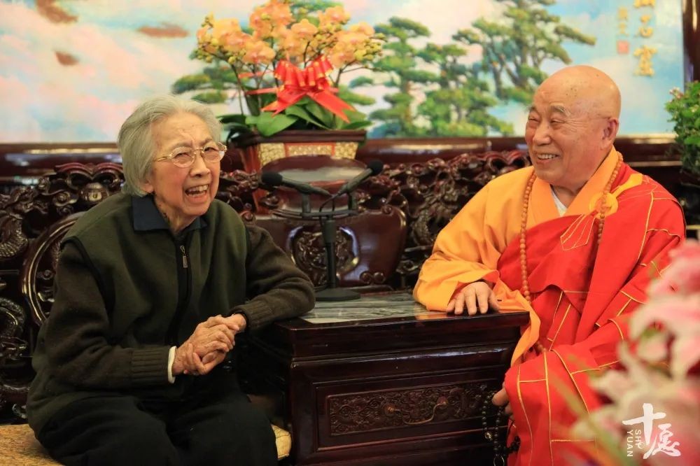 2010年5月13日,在纪念赵朴老逝世十周年纪念活动中,传印长老与赵朴初夫人陈邦织女士亲切交谈