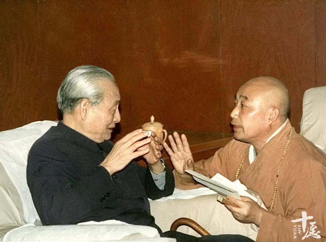 1988年9月,中国佛学院院长传印法师与赵朴初居士在一起谈话交流