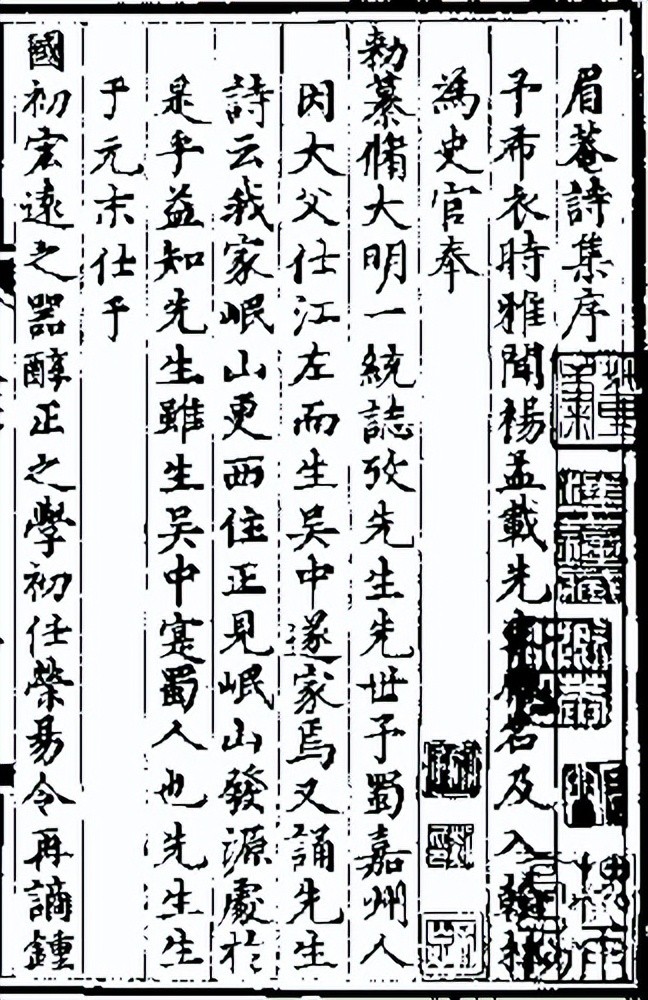 杨基(1326—?),字孟载,号眉庵,元末明初诗人、画家,明初十才子之一。杨发之后,杨枢之孙,杨元德之子,生于吴县(今江苏苏州)。诗风清俊纤巧,并工书画。书师锺繇,行草师二王;画长墨竹,兼善山水。曾著《论鉴》十万余言,与杨维桢友好。著有《眉庵集》12卷,补遗 1卷,按古体、歌行、律诗、绝句、长短句及词曲分卷排列,明成化重刻时,江朝宗为之作序。