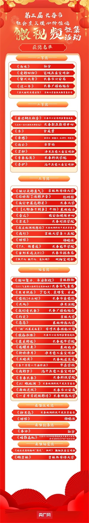 此外,经过评委们的现场审阅并投票,由长春北湖科技开发区管委会报送的《种月亮》,杨迪报送的《团圆》获得最佳技术奖;孙宇报送的《春分》,长春市公安局净月高新技术产业开发区分局报送的《暗影危机》获得最佳创意奖;朝阳区委宣传部报送的《现在这条街就叫“新民”,极好》,吉林外国语大学报送的《瞰吉林》获得最佳视觉奖。同时,由华岳学校报送的《第十万零一个为什么》等20部作品获得了优秀奖。