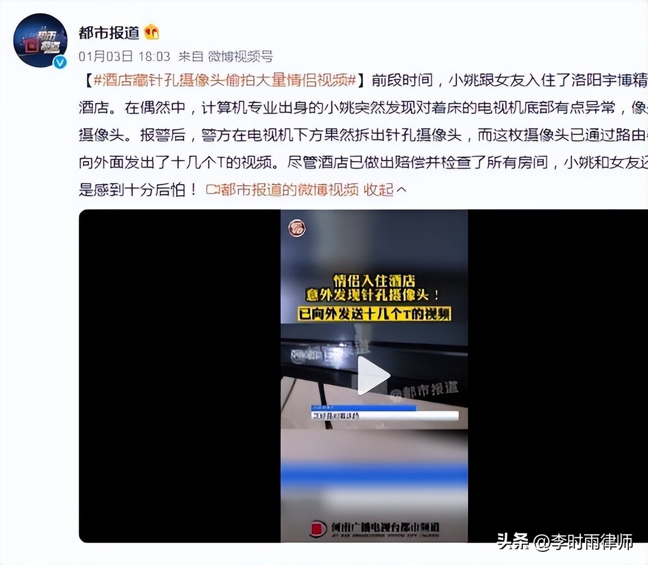 - 2019年1月,西安一市民入住某高校附近的快捷酒店后,在房间内的插座中发现针孔摄像头,镜头正对着床的位置,内有一个16G的存储卡,拆下来后发现该摄像头已录下近1200段视频。