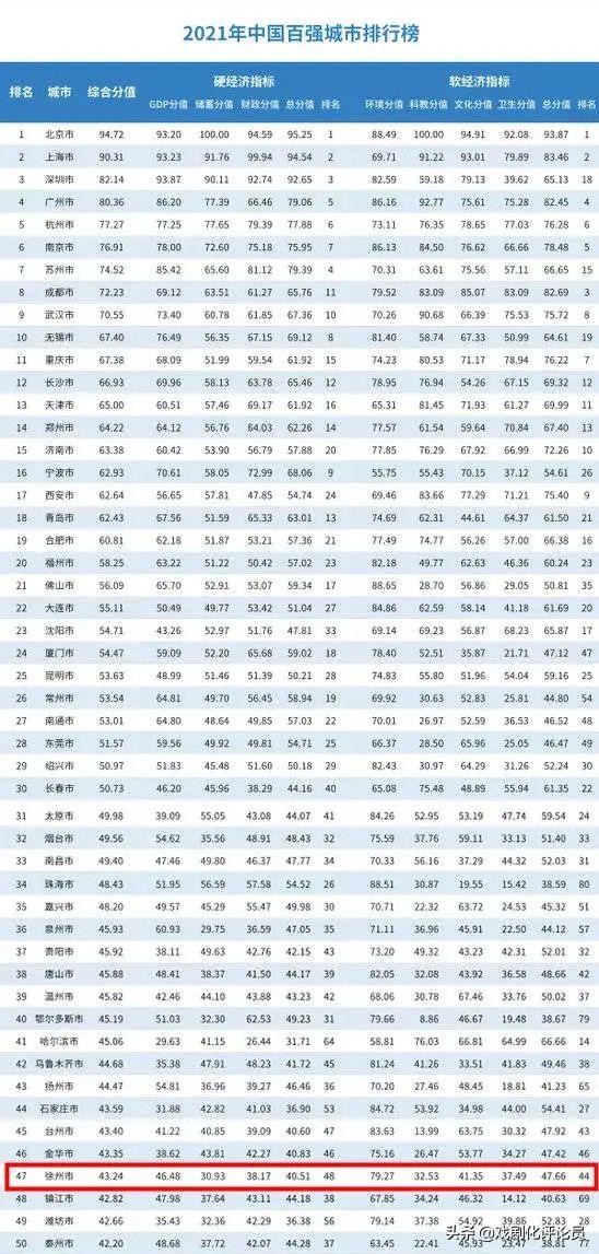 大致可以认为,徐州的经济社会发展水平,不及胶东沿海和济南,但强于山东大多数城市,参考《2021中国百强城市排行榜》排名,徐州的综合实力全国47名,江苏省第7,山东省第4,总体处于江苏省中等水平以及山东省中上水平。