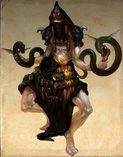 经文:巫咸国在女丑北,右手操青蛇,左手操赤蛇,在登葆山,群巫所从上下也。