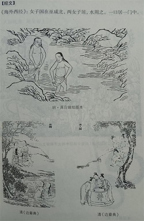 古人认为:(女子国都是女性。)女子国在巫咸国的北方,里面住着的都是女子,她们两两居住一起,附近有水环绕着。还有一种说法是这些女子住在同一个院门的不同房间。