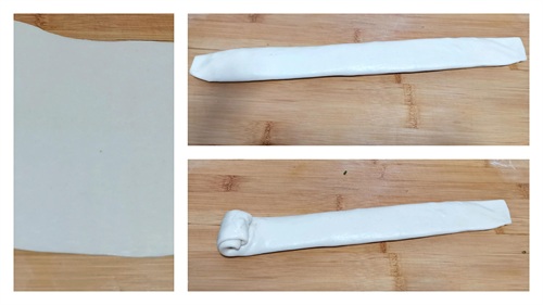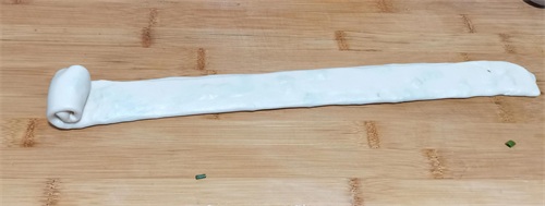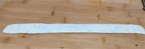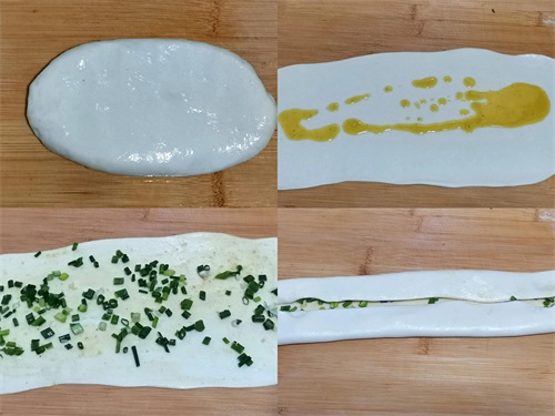 3.案板上抹上少许的油,将醒好的面团取出一个放入案中,用擀面杖擀成厚约0.1厘米的长方形薄饼,用刷子刷上油酥,再撒上葱花,上下两边像中心线对折,再对折一次,两头捏紧,轻轻拉长,再从一头向另一头边卷边抻一下,卷到最后把另一头缩在底部,再用掌心轻轻压一下。以次做好后,盖上保鲜膜松弛10分钟。再擀成厚约0.3厘米的圆形大饼胚。