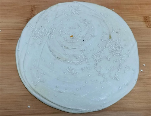 和做法同样的做法:将醒好的面团取出一个放入案中,用擀面杖擀成厚约0.1厘米的长方形薄饼,用刷子刷上油酥,上下两边像中心线对折,再对折一次,两头捏紧,轻轻拉长,再从一头向另一头边卷边抻一下,卷到最后把另一头缩在底部,再用掌心轻轻压一下。以次做好后,盖上保鲜膜松弛10分钟。再擀成厚约0.3厘米的圆形大饼胚,撒上白芝麻,用手轻轻按压几下即可。