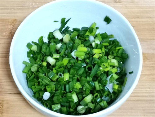 2.小葱切末装碗备用,再取一个空碗,加入2小勺面粉,适量的盐和十三香,泼入热油,快速搅拌成稀油酥备用。