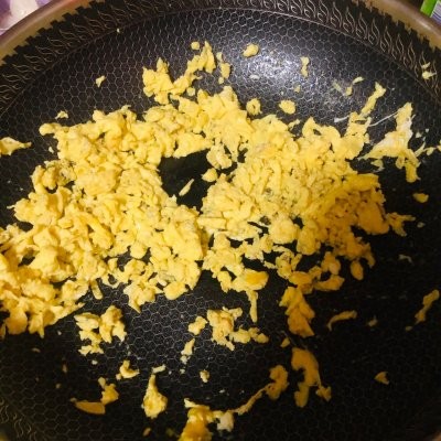 5、锅内放适量油,速度将碗中鸡蛋搅拌至图片形状,捞出备用。