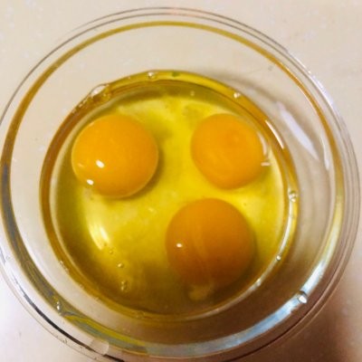 4、碗入打三个老母鸡蛋,放料酒去腥,顺时针搅拌即可,待用