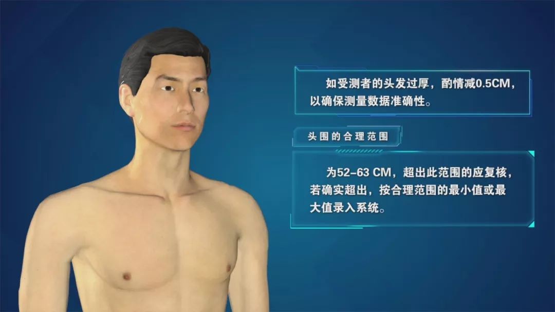 测量时,软尺不能拉得太紧,还要考虑被测者的发型和刘海头发厚度,确保测量头围的数据准确性。