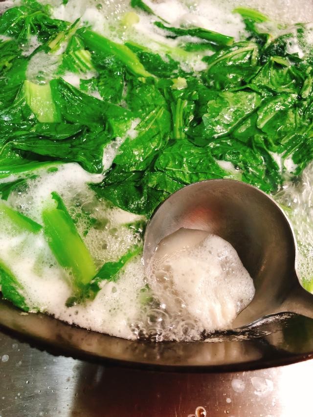 当水烧开之后,放入芥菜段,继续大火煮开。