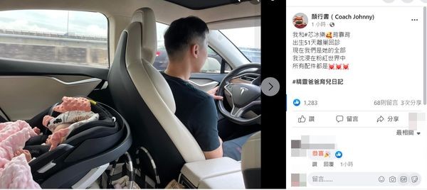 颜行书24日在脸书PO出带女儿出门的照片,写道:「我和#芯冰乐背靠背,出生51天离巢回诊,现在我们是她的全部,我沉浸在粉红世界中,所有配件都是!」还附上3个爱心符号,言语之间满是当爸的喜悦,只见女儿躺在安全座椅中熟睡,隐约可看到鼻子相当高挺,遗传到爸爸的好基因。