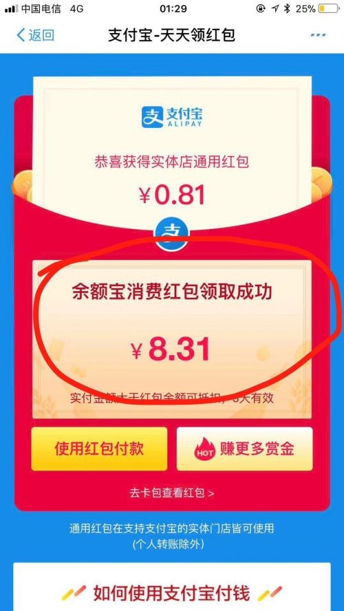 有领到支付宝余额宝消费红包的效果如上图所示,想知道怎么用的朋友请继续往下看。