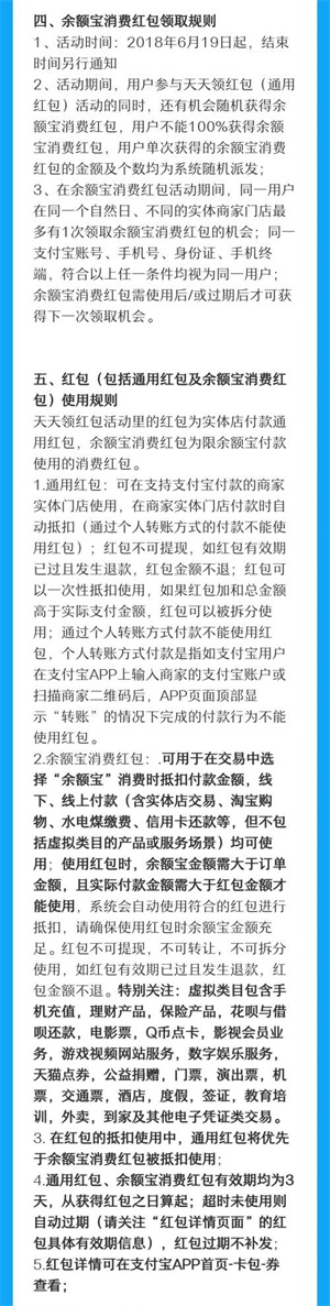 从2018年6月19日起,用户参与天天领红包活动的同时,还有机会随机获得余额宝消费红包。