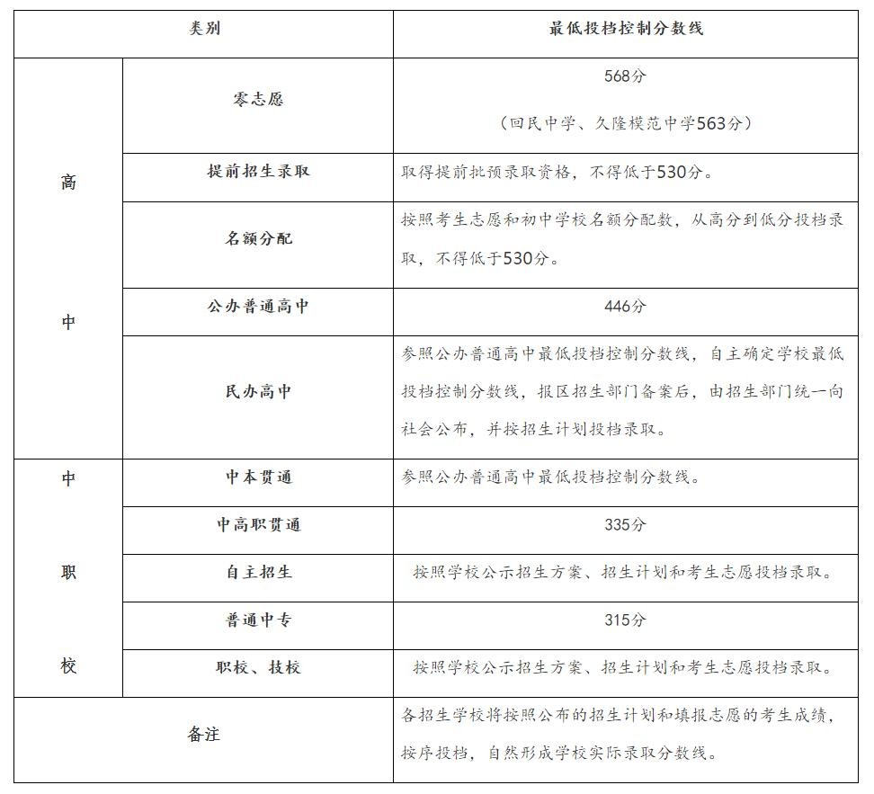 市教育考试院今天18时权威发布高中阶段学校招生最低投档控制线:零志愿568分(回民中学、久隆模范中学563分), 取得提前批预录取资格不得低于530分,公办普通高中446分。各类分数线详见下文。
