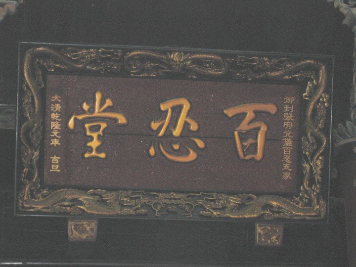 五、“百忍堂”张氏在东南亚。二百多年来,由广东、福建、浙江去马来西亚、新加坡及台湾的张姓后人,继承在家乡时的传统,在当地修建宗祠“百忍堂”。对此,洛杉矶《时局分析周刊》创办人、美籍华人张庆松博士,于2006年 撰文指出,东南亚一带的张姓约五万人,分清张、张廖、张简三支。“清张”出自清河郡一脉,他们供奉张歆为始祖公,本省(指台湾)主要是清张。在本省,特别 在宁静的乡村,座落在阡陌间的红砖农舍,只要留心观察,必然会发现不少人家,在两扇大门上方,恭书“清河郡”的牌子。登堂入室来到正厅,又会看到不少人家 高悬“百忍堂”的匾额,还可见到“齐家公艺,治国子房”的联语,有的人家则书“事不三思总有败,人能百忍方无忧”的联语。他们以这种方式向世人顽强地表 示:我姓张,来自中国北方的清河地区,我们的始祖有一位叫张公艺,互相容忍互相谅解兴旺起一个九代同堂的大家族,我们将奉行不渝!其实,早些年,有一位竞 选成功的台中市市长,就是清张后人,他在各处演讲时,大讲特讲唐朝张公艺的故事,声称自己是“百忍堂”张家的后代,为自己拉了不少选票。他们的虔诚,不可 不令我们格外珍视。清张对台中盆地的开发,功不可没。清朝雍正年间,广东“百忍堂”张姓人家,渡海来台,在台中地区开垦。当时,台中是番仔(土著民)的地 盘。“百忍张”的代表人物张达京出资开圳(圳:田间水沟,此指兴修水利),番仔则出让土地换取他的水利。不久,张达京娶番仔首领的女儿为妻,成为“番仔驸 马”,在台中引起轰动。在张达京的带动影响下,从神冈到丰原、潭子、石冈、东势及新庄一带,迅速出现了大陆移民的聚落。满清乾隆皇帝上台不久,把张达京和 番仔首领请到北京,面圣褒扬。