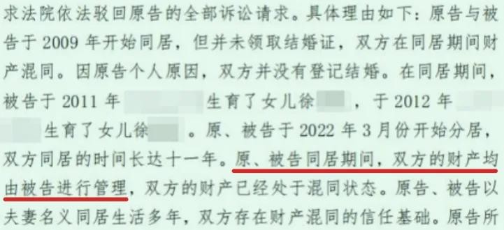 相反,三妞妈的律师根据转账记录这些铁证,主张“原被告同居期间,双方的财产均由被告管理,双方的财产已经处于混同状态”。