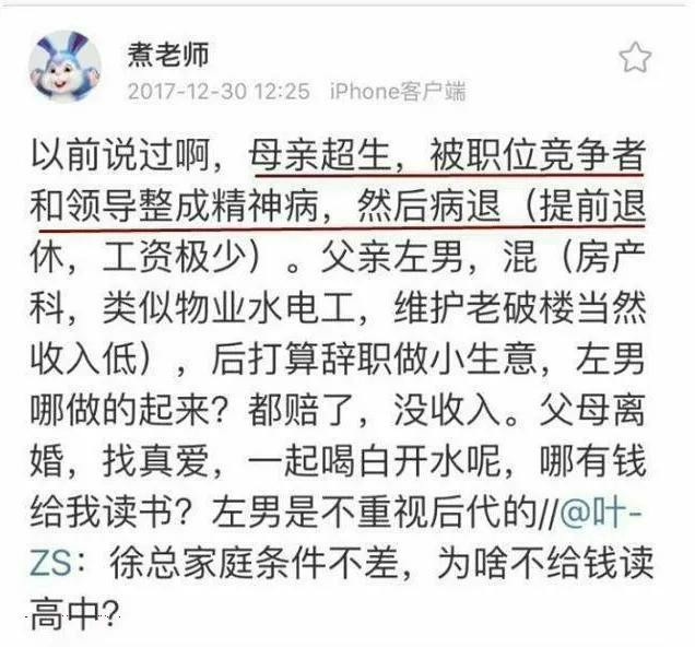 煮老师毫无顾忌地大爆家丑,说自己母亲是精神病,父亲是左男,混子,无能。