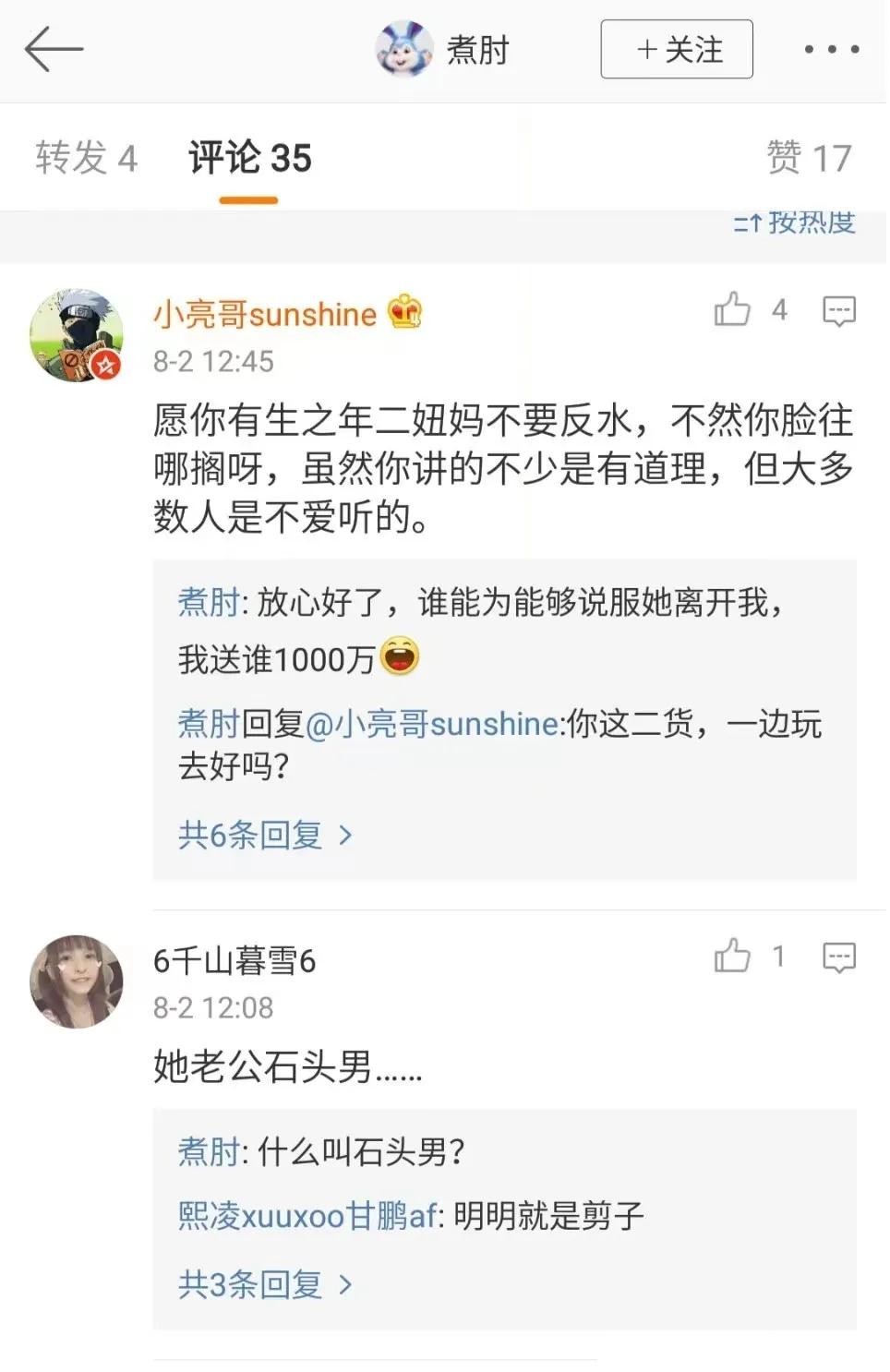 煮老师一直活跃在微博一线,与广大貂丝群众打成一片,留下了许多战斗性强、又不留余地的发言,到今天与后宫之主三妞妈闹翻,两相对比之下,笑料自然是满满的。