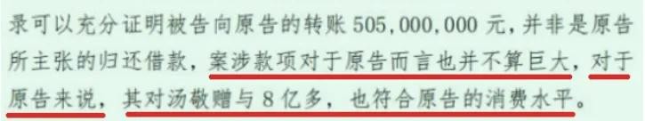 即使是这么大金额的财产,在法官看来:案涉款项对于原告而言也并不算巨大,对于原告来说,其对被告赠与8亿多,也符合原告的消费水平。