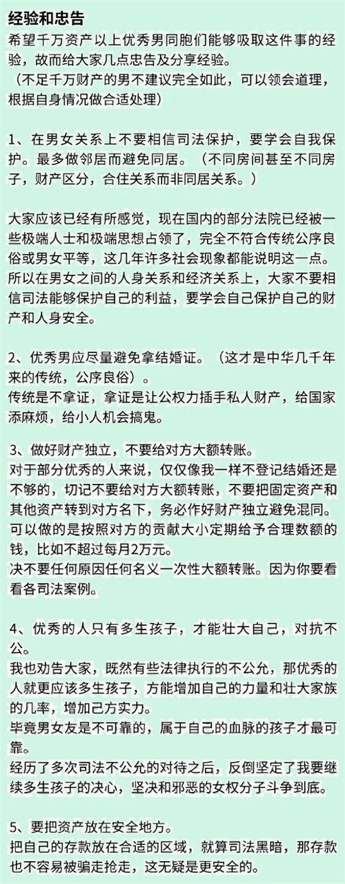 经过此次真爱背叛,“司法不公”,煮老师非常伤心。但是他越挫越勇,根据新形势,总结了5条经验和忠告,给千万资产以上优秀男同胞借鉴。