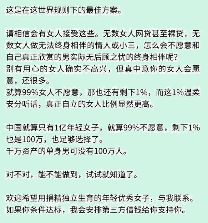 煮老师明确说明他的目的,就是生娃,要生至少50个优质的儿子。