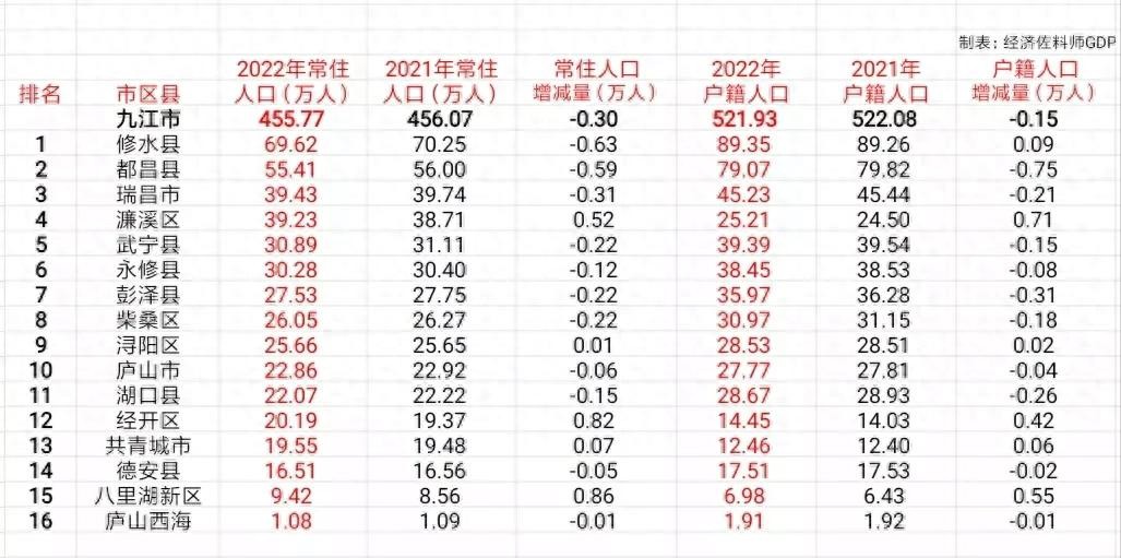 本次人口统计,因九江市几个功能区跨区县(市经开区横跨三个行政区,庐山西海也跨永修、武宁县),人口不好分配给行政区,故按全市16个功能统计区域来统计人口。(上面表格按2022年常住人口排序)